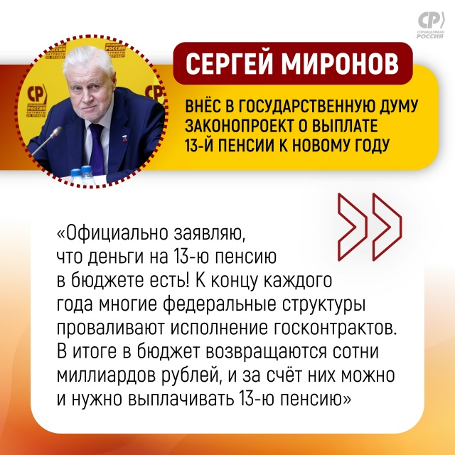 "Официально заявляю, что деньги на 13-ю пенсию в бюджете есть! К концу каждого года многие федеральные структуры проваливают исполнение госконтрактов. В итоге в бюджет возвращаются сотни миллиардов рублей, и за счёт них можно и нужно выплачивать 13-ю пенсию", – заявил парламентарий.